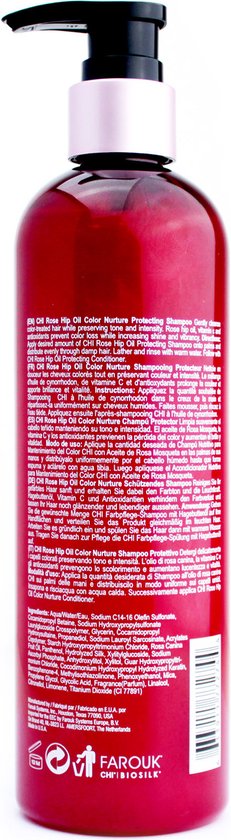 CHI Rose Hip Oil Color Nurture Protecting Shampoo Reinigt gekleurd haar op een milde wijze met behoud van kleur en intensiteit rozenbottelolie vitamine C en antioxidanten voorkomen kleurverlies en verhogen de glans en levendigheid Gebruik Aanbrengen op nat haar Inmasseren en uitspoelen met warm water