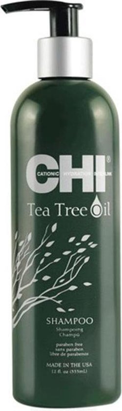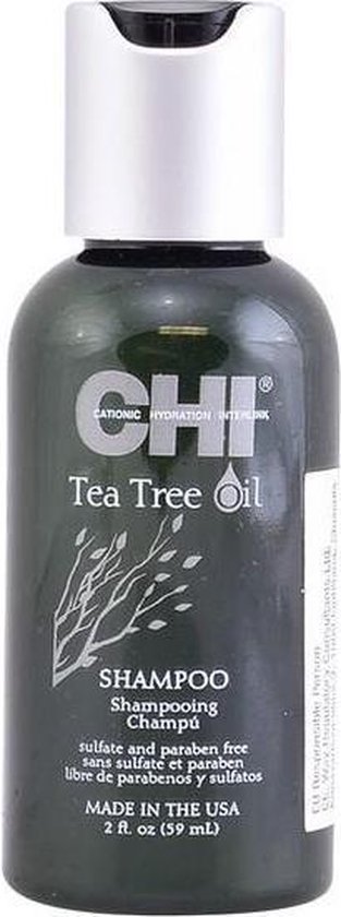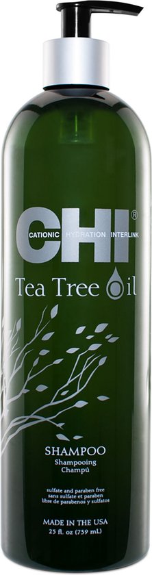 CHI Tea Tree Oil Shampoo Een milde zachtreinigende shampoo die de hoofdhuid verfrist en rustgevend werkt Met Tea Tree olie pepermunt olie zijde en kamille Gebruik Aanbrengen op nat haar voorzichtig laten schuimen op de hoofdhuid grondig uitspoelen