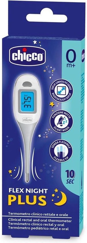 Chicco Flex Night Plus is de digitale thermometer van Chicco die dankzij de achtergrondverlichting meting laat zien in het donker, zonder het licht aan te doen. De Flex Night Pus thermometer heeft een extra grote display.