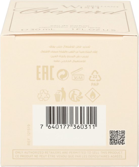 Chopard Brilliant Wish Eau de Parfum is een kruidige houtachtige geur. De geur straalt schoonheid, vrouwelijkheid en elegantie uit en benadrukt de sensualiteit van de vrouw. De combinatie van fruit, peper, jasmijn en hout mengt zich harmonieus in de top, de basis en de hartnoten. Chopard Brilliant Wish is een geur die dagelijks gedragen kan worden, maar is ook zeker geschikt voor speciale gelegenheden.-Chopard Brilliant Wish Eau de Parfum Spray 30 ml