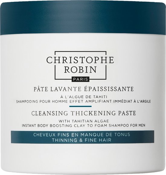 De Christophe Robin Cleansing Thickening Paste with Tahitian Algae is een rijke en verdikkende pasta en zorgt voor meer volume vanaf de haaraanzet en meer dikte in de haarvezels. Het is speciaal ontwikkeld voor mannen en het voedt en beschermt de hoofdhuid. De innovatieve Paste Cream verandert tijdens gebruik in een zachte en lichte schuim en verwijdert onzuiverheden van de hoofdhuid. Het bevat Tahitiaanse algen en versterkt de haarwortels, zodat ze voller lijken. De pasta is gemaakt van 95% natuurlijke ingrediënten en is vrij van parabenen, siliconen, SLS en kleurstoffen.