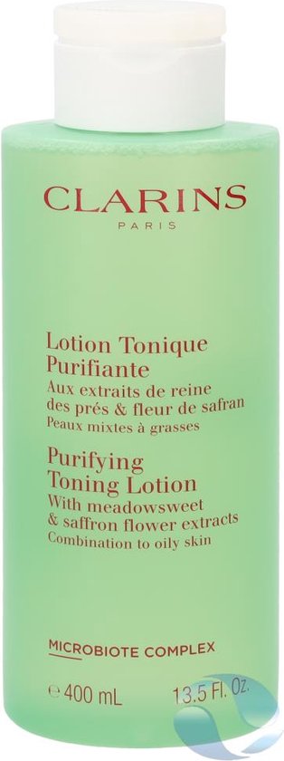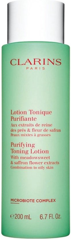 Clarins Purifying Toning Lotion is een verfrissende en alcoholvrije toner die de huid na het reinigen zuivert en kalmeert. De lotion verwijdert de laatste restjes make-up en onzuiverheden, terwijl het de poriën verkleint en de huidtextuur verfijnt. De formule bevat extracten van iris en salie die de talgproductie reguleren en de huid fris en schoon laten aanvoelen.