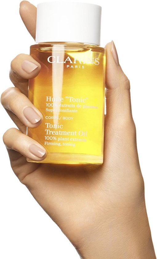 Tonic Body Treatment Oil Firming/Toning van Clarins is een hydraterende, verfrissende bodyolie samengesteld uit 100% pure plantenextracten geformuleerd met munt, rozemarijn, geranium en hazelnoot olie dat een voedende en vochtvasthoudende werking heeft. De bodyolie helpt bij het versterken, verstevigen en vernieuwen van de huid waardoor het ontstaan van striae wordt verminderd. Voor een fluweel zachte huid. Vooral geliefd onder zwangere vrouwen als preventie tegen striae.