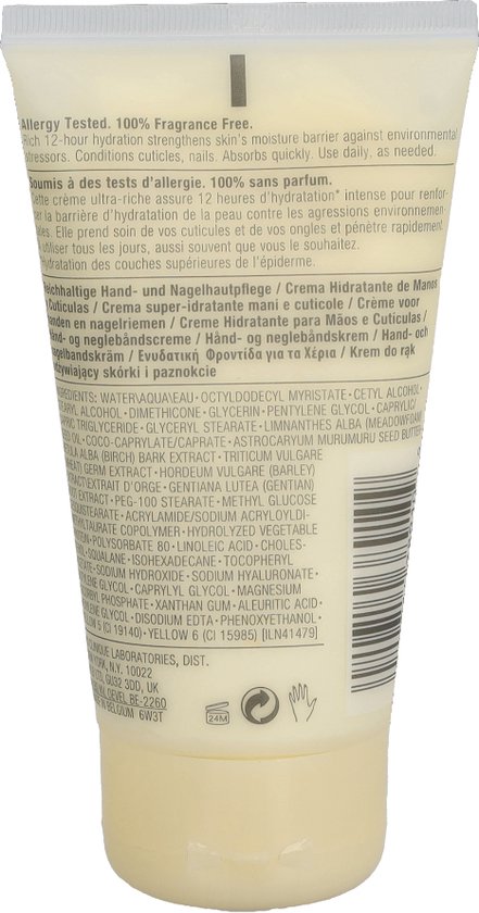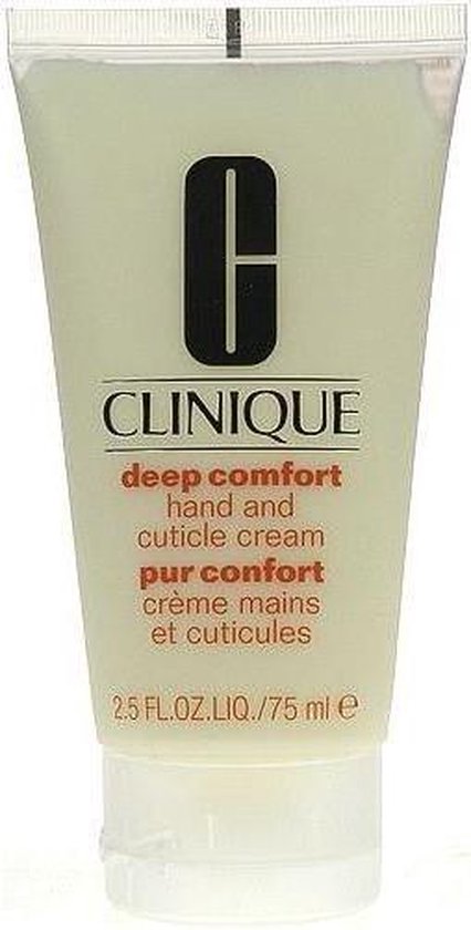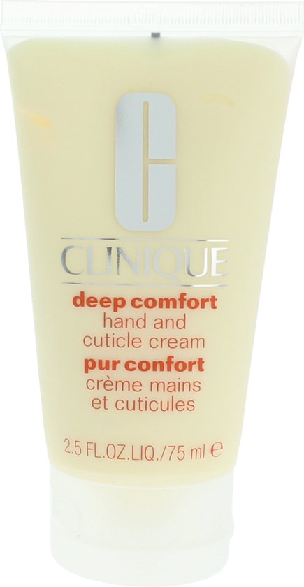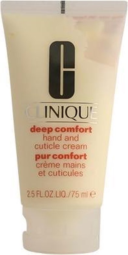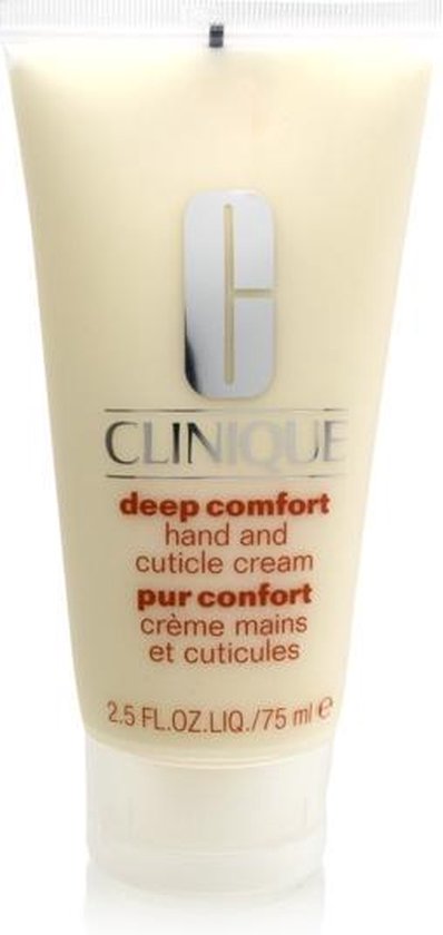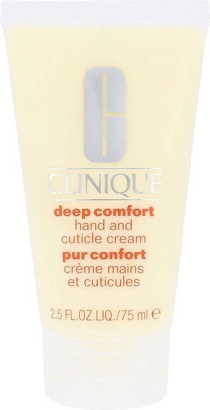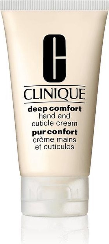Clinique Body Deep Comfort Hand And Cuticle Cream De handcrA me verwent de handen met een verzachtend comfort en een hydratatie die tot 12 uur houdt Deze rijke herstellende crA me zorgt dat de handen er zachter uit gaan zien en zacht aanvoelen De handcrA me voedt ook uw nagelriemen en nagels De crA me is vetvrij 100 parfum vrij en bovendien getest op allergieA