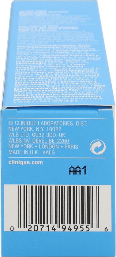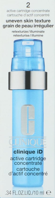 Clinique iD Active Cartridge Concentrate Uneven Skin Texture De blauwe booster bevat pure geconcentreerde percentages Alpha Hydroxy Acids en andere actieve werkstoffen die de zichtbaarheid van porien reduceren en de huidstructuur zo verbeteren dat de huid frisser en helderder is Na eenmalig gebruik is de huid direct glad Gebruik in combinatie met een hydratatiebasis