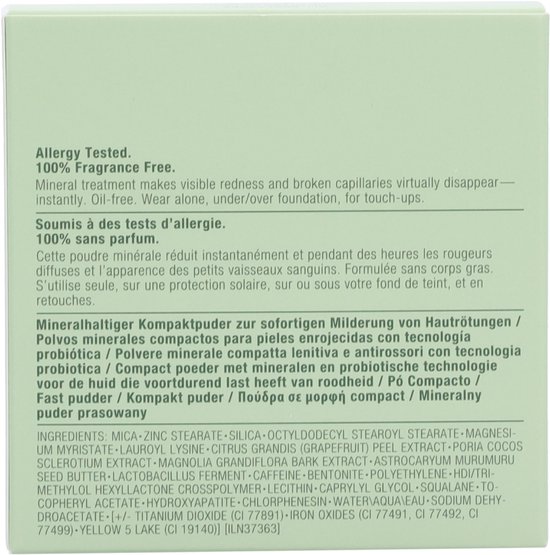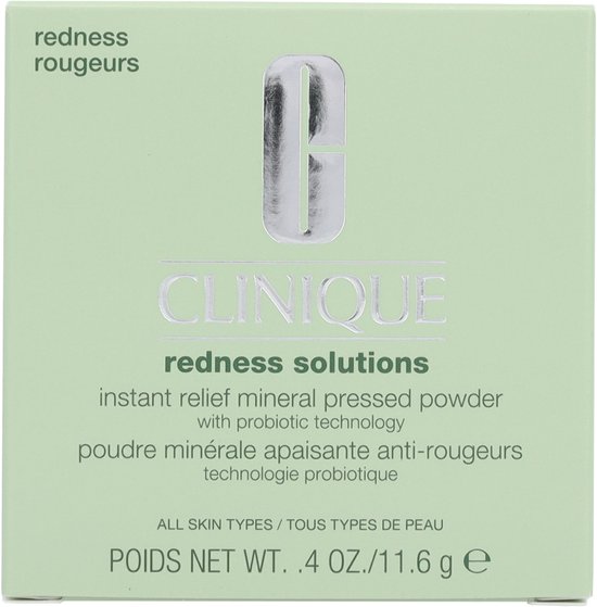 Clinique Redness Solutions Instant Relief Mineral Pressed Powder Dit poeder kalmeert de huid en verhult de roodheid in het gezicht De bijzondere kleur van het romige poeder is speciaal ontwikkeld om roodtinten te neutraliseren en een gelijkmatige teint te creA