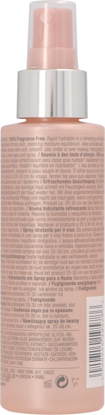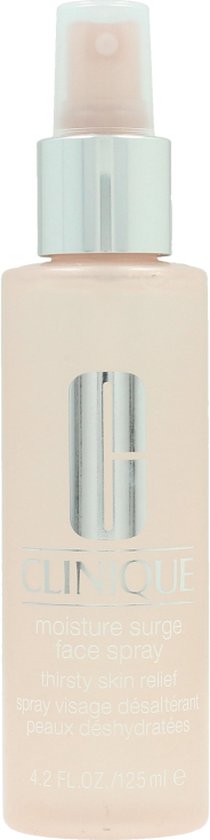 Clinique Moisture Surge Face Spray Thirsty Skin Relief Deze verfrissende gezichtsspray voorziet de huid van het nodige vocht De gezichtsspray zit vol vochtinbrengers en actieve aloA vera en is geheel vetvrij De spray vult het vocht aan herstelt het vochtbalans en verzacht en kalmeert de huid De spray die bedoeld is voor alle huidtypen is 100 parfumvrij en getest op allergie Gebruik Houdt de spray op 25 30cm afstand van het gezicht Sluit de ogen en spray een lichte mist Gebruik als aanvulling op de dagelijkse moisturizer onder of over make up daar waar de huid behoefte heeft aan hydratatie