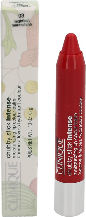 Clinique Lips Chubby Stick Intense Moisturizing Lip Colour Balm Deze Chubby Stick Intense is een combinatie van een vocht inbrengende lipbalsem en een dekkende lipstick Gevuld met mango en shea boter zodat de lippen comfortabel zacht en soepel aanvoelen De lipstick is 100 parfumvrij en getest op allergie Kleur Mightiest Maraschino