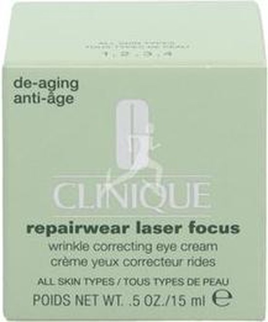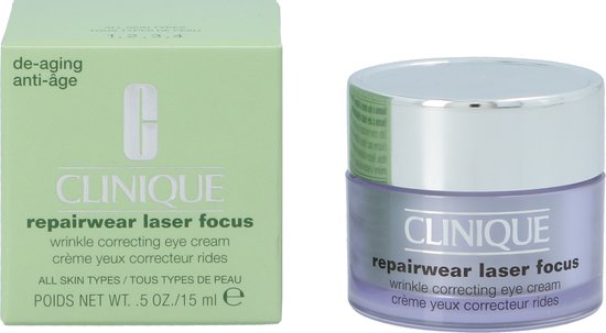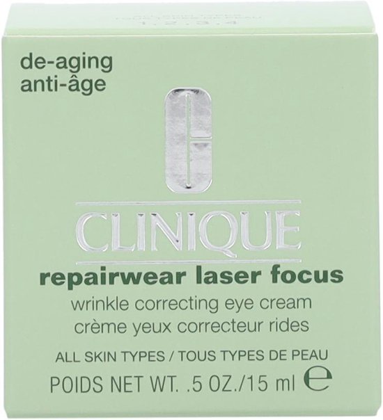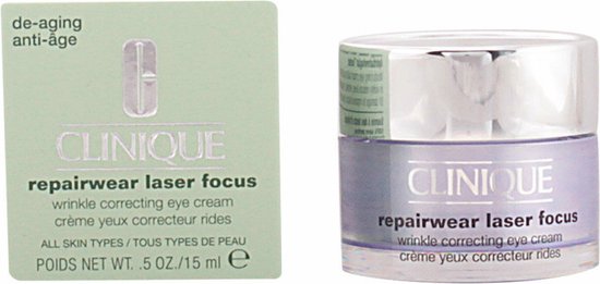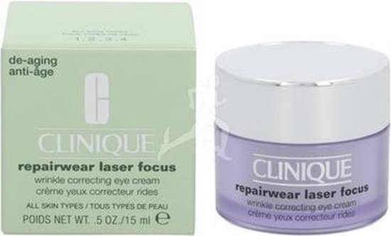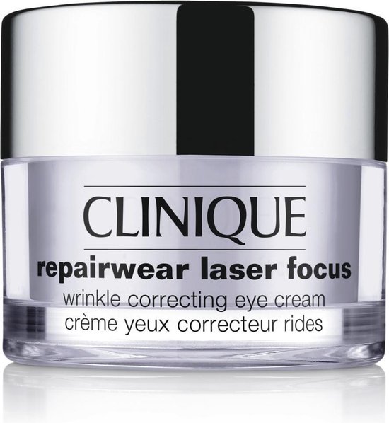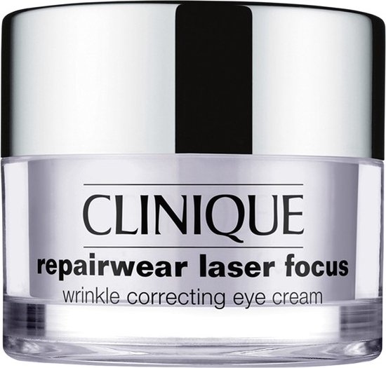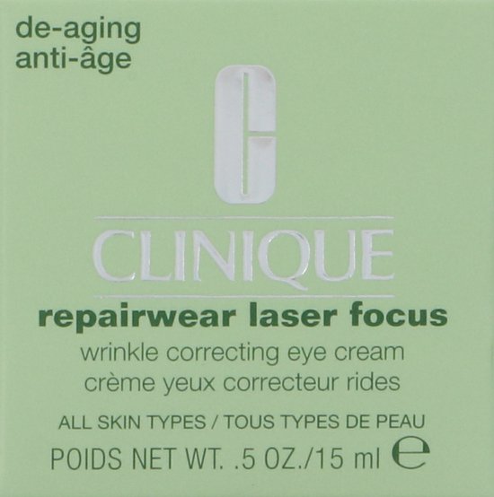 De Repairwear Laser Focus Wrinkle Correcting Eye Cream is ontwikkeld met de gepatenteerde technologie van Clinique’s krachtige antirimpelserum en is speciaal bedoeld voor herstel van de zichtbare tekenen van veroudering rond de ogen. De crème herstel UV-schade, vermindert fijne lijntjes en rimpels en verbetert de huidstructuur. Het versterkt de vochtbarrière van de huid en beschermt deze tegen invloeden van buitenaf. Voor een mooie gladde huid rondom de ogen. De crème is getest door oogartsen en is geschikt voor alle huidtypes.