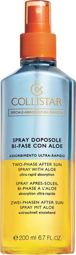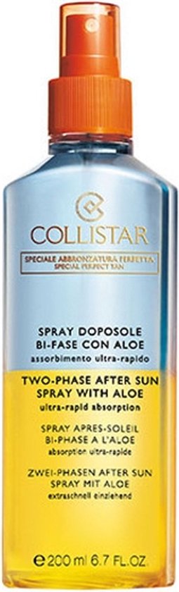 COLLISTAR Sun Two Phase After Sun Spray Deze twee fasen aftersun die snel in de huid wordt opgenomen combineert de rijke verzorging van een olie met de lichte textuur van een fluid De huid die rood ziet en branderig aanvoelt als gevolg van zonnebaden wordt direct gekalmeerd onder andere door aloA vera Calendula macadamia en zoete amandeloliA