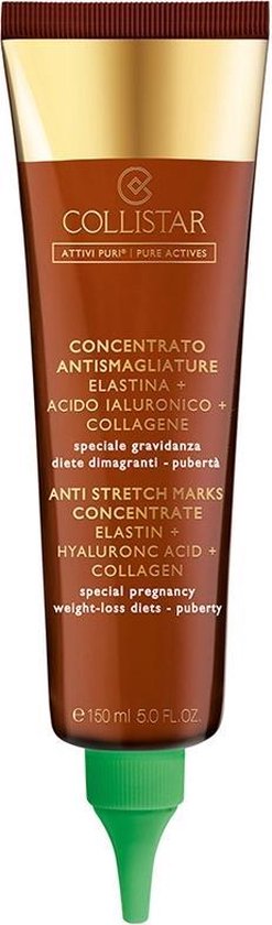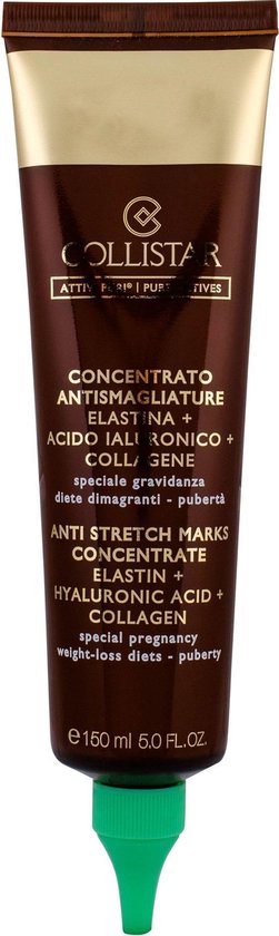 Anti-Stretch Mark Concentrate van Collistar met Pure Actives® (pure actieve ingrediënten) zorgt voor de behandeling van Striae. De mix van elastine, hyaluronzuur en collageen heeft een preventieve en een actieve werking tegen striae: