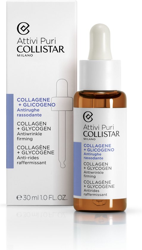 Collistar Attivi Puri Collagen + Glycogen is een verzorging in geconcentreerde druppels met aminozuren van plantaardig collageen om een intense verstevigende werking tegen huidveroudering en rimpels te creëren. Aan het plantaardige collageen is glycogeen toegevoegd: de energiebron die de productie van collageen versnelt. Al na enkele keren gebruik ziet de huid er steviger en zachter uit. Bij regelmatig en ononderbroken gebruik wordt de huid strakker, soepeler, sterker en beter beschermd. De rimpels en expressielijnen vervagen en de gezichtscontouren worden geleidelijk aan geherdefinieerd. Geschikt voor alle huidtypen, inclusief de gevoelige huid. Combineer de verzorging in druppels met de crème voor een optimaal resultaat.-Collistar Attivi Puri Collagen + Glycogen Gezichtsserum 30 ml