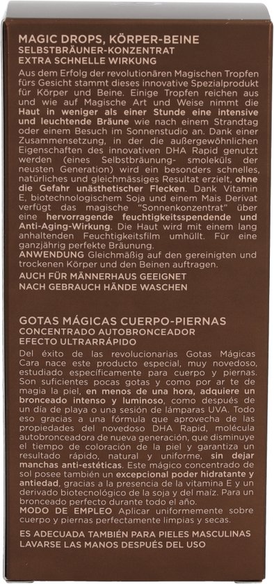 Deze innovatieve selftanner voor het lichaam komt voort uit het succes van de revolutionaire Magic Drops voor het gezicht. Slechts een paar druppels van dit concentraat volstaan voor een intens en stralend bruin resultaat, alsof u een dag naar het strand bent geweest of een sessie onder de zonnebank heeft gedaan.