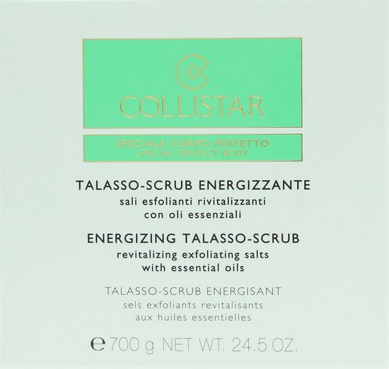 Collistar Energizing Talasso Body Scrub heeft een revitaliserende en herstellende werking en combineert de voordelen van thalassotherapie met die van aromatherapie. De scrub is geformuleerd met een mix van 90 soorten zeezout met verschillende korrelgrootte, een melange van plantaardige oliën en zuivere aromatische oliën. De mix van zeezouten heeft een heilzame werking en de melange van oliën voedt de huid en geeft het gevoel van energie en vitaliteit.