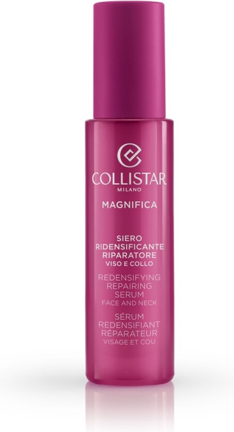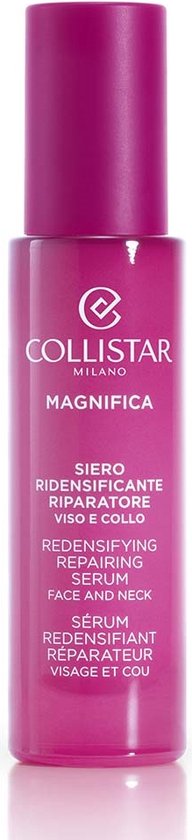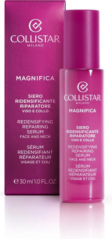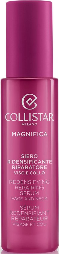 De Magnifica Redensifying Repairing Serum Face and Neck van Collistar is een zeer intensieve behandeling tegen huidveroudering die gelaatstrekken verfijnt, het gezicht meer volume geeft, de huid verstevigt en onmiddellijk de huidkwaliteit verbetert. De nieuwe combinatie van extracten, formules en bestandelen resulteert in een onmiddellijk gezondere en mooiere huid: de epidermis wordt dikker, de teint wordt gelijkmatiger, de huidtextuur wordt fijner en de rimpels worden opgevuld. Ziet er voller uit, maar voelt lichter aan en is daarom perfect voor alle huidtypes, ook de gevoelige huid.