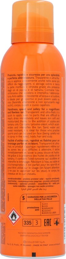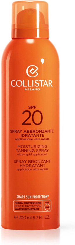 Collistar Moisturizing Tanning Spray met SPF 20 is een innovatieve zonnebrand spray. De zonnebrand heeft een lichte textuur en wordt makkelijk en snel door de huid geabsorbeerd en plakt niet. De zonnebrand is geformuleerd met jojoba en tamanu olie die de huid hydrateren en zorgen dat deze zacht en soepel aanvoelt en met oleil tyrosine dat de aanmaak van melanine stimuleert waardoor de huid sneller een bruine teint heeft. De 360° spray zorgt ervoor dat moeilijke plekken makkelijk te bereiken zijn zodat het gehele lichaam beschermt is. Voor het gezicht en lichaam. Water- en transpiratieproof.