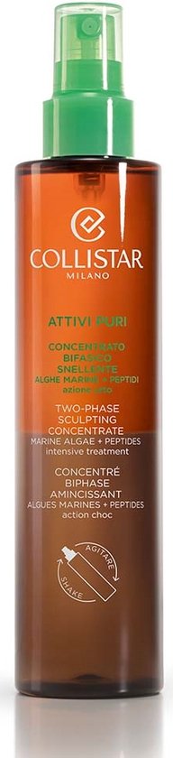 Een exclusief tweefasig concentraat van de Pure Actives Two-Phase Sculpting Concentrate van Collistar is op basis van zeealgen en peptiden voor een shockbehandeling om af te slanken en het lichaam te verstevigen op probleemzones. In de oliefase helpen vier krachtige, vochtafdrijvende en vetsplitsende algen bij de afvoer van overtollig vocht. In de waterfase verminderen zorgvuldig geselecteerde peptiden de vetophoping in de adipocyten, waardoor het silhouet wordt verstevigd. De kracht van de samenstelling wordt nog versterkt door Transcutol, een materie die de opname van actieve bestanddelen vereenvoudigt. Dringt onmiddellijk in de huid zodat je je meteen kunt aankleden. Bij regelmatig gebruik wordt de huid gladgestreken, het huidweefsel steviger, neemt vetophoping af en krijgt het lichaam zijn strakke vorm terug (op basis van cosmetische werking, geeft geen gewichtsverlies).