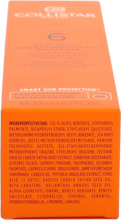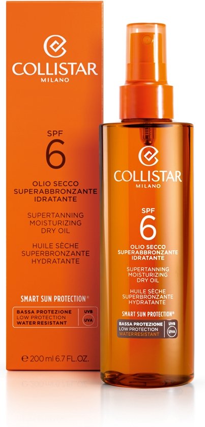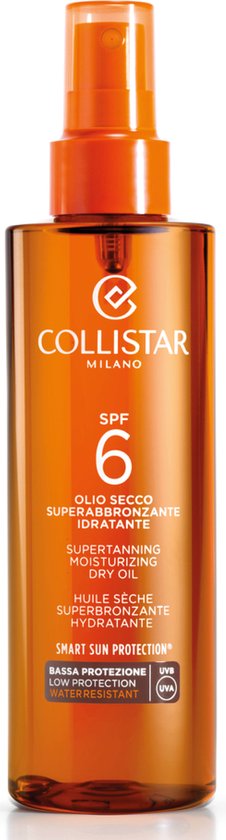 De Supertanning Dry Oil van Collistar is een zonnebrandolie met SPF 6 die geschikt is voor het gezicht, het lichaam en de haren. De dry olie zorgt voor een snelle bruining van de huid zonder dat deze de huid vettig of plakkerig laat aanvoelen en trekt snel in. De olie is verrijkt met vitamine E, calendulaolie, hazelnootolie, wortelolie en walnootdopolie die een waterresistent laagje op de huid achterlaten.