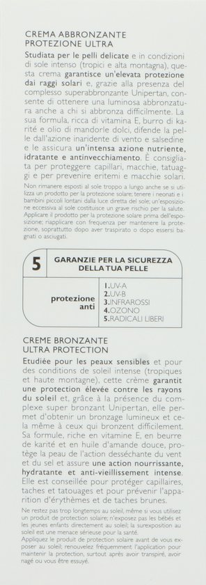 Collistar Ultra Protection Tanning Zonnebrandcrème met SPF 30 beschermt de huid, zelfs wanneer de zon heel sterk is. Het Unipertan®-complex helpt de huid geleidelijk bruin te worden, ook de huid die moeilijk bruint. De zonnebrandcrème is geformuleerd met Vitamine A, shea butter en amandelolie die de huid beschermen tegen uitdroging en huidveroudering. De zonnebrandcrème wordt aanbevolen voor de bescherming van haarvaatjes, pigmentvlekken en tatoeages en voorkomt sproetjes. Voor het gezicht en lichaam. Water-en transpiratieproof.