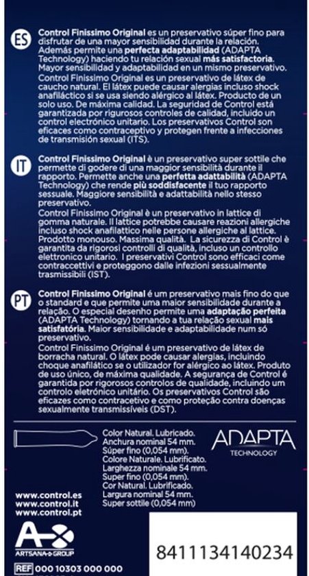 Control’s finest condom. Its super-thin thickness makes it easy to enjoy extreme sensitivity, while its ergonomic shape favors optimal adaptability. Made of latex, reservoir and lubricated.