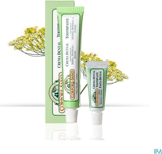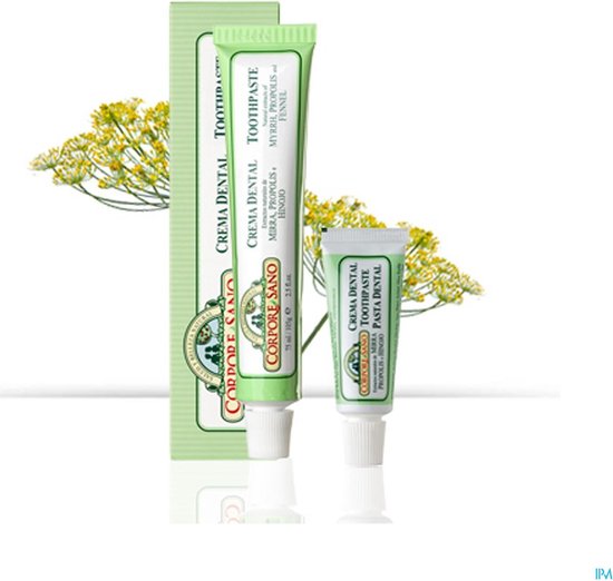 Dicalcium phosphate dihydrate: Aqua (water), Sorbitol, Silica, Kaolin, Sodium lauryl sulfate, Cellulose gum, Aroma (flavour), Limonene, Propolis extract, Foeniculum vulgare (fennel) fruit extract, Commiphora myrrha resin extract, Propanediol, Glycerin, Sodium saccharin, Phenoxyethanol, Potassium sorbate, Sodium benzoate, CI 42090, CI 19140