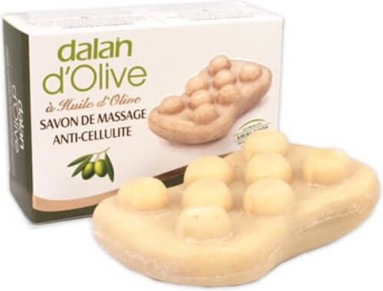 Dalan d’Olive – Zeep Massage 150 gr. Dalan d’Olive massage en Anti Cellulite zeep helpt cellulite te verminderen en maakt uw huid jonger en gladder door tarwekiemolie, tijm, druivenpitten, olie, olijfzaad en eneverbes. De zeep is makkelijk te gebruiken onder de douche of in bad dankzij de ergonomische vormgeving.