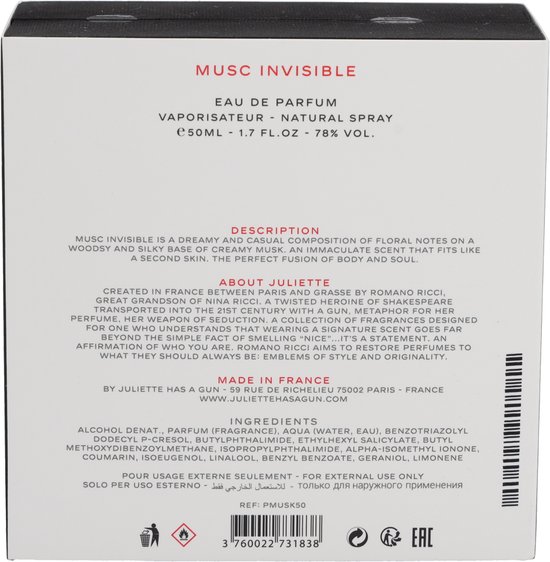 Laat je verrassen door het 100% originele Damesparfum Juliette Has A Gun EDP Musc Invisible (50 ml) en geef je vrouwelijkheid een boost dankzij dit exclusieve vrouwenparfum met een unieke en persoonlijke geur. Ontdek de 100% originele Juliette Has A Gun producten!