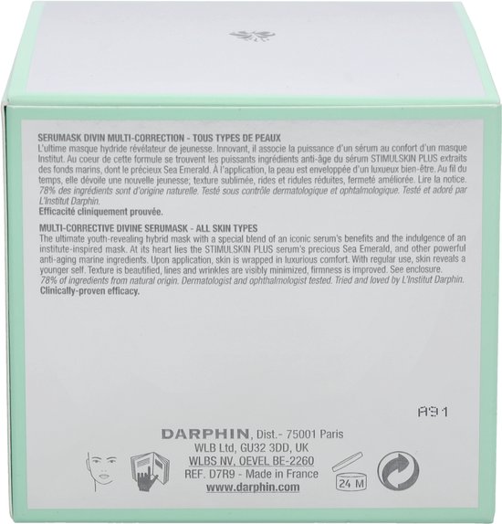 Darphin Face Care Mask Stimulskin Plus Serumask Deze multicorrigerende anti verouderingsverzorging is een ideale aanvulling op het serum De crA me biedt een totale verbetering van de weefseldichtheid Zo ziet het gezicht er jonger en dynamischer uit Lijntjes en rimpels worden vervaagd en de crA me helpt de huid te herstellen en de celvernieuwing te bevorderen De aanmaak van collageen en elastinevezels worden ondersteund waardoor de huid opgevuld en zichtbaar steviger wordt Het geeft de huid een heldere en stralende teint Daarnaast heeft de crA me een liftend effect Resultaten Directe lifting voor de huid Verfijnde huidstructuur Huidvernieuwend Absolute weldaad voor de huid en geestGebruik s Morgens en s avonds een klein beetje aanbrengen op het gezicht de hals en decolletA c Zacht inmasseren van binnen naar buiten In de ochtend crA me aanbrengen na het aangewezen serum In de avond aanbrengen na het aangewezen aromatische care Voor een intensieve behandeling eerst het serum aanbrengen voor de aromatische care Tot slot de crA me