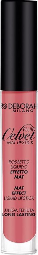 De Fluid Velvet Mat Lipstick van Deborah Milano geeft een intense dekking. De extreem comfortabele fluid textuur garandeert een longlasting resultaat die niet afgeeft en heeft een mooie matte finish.