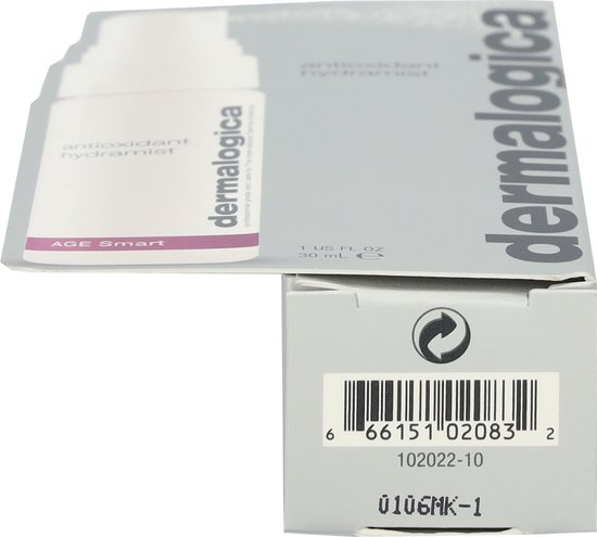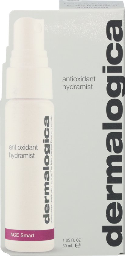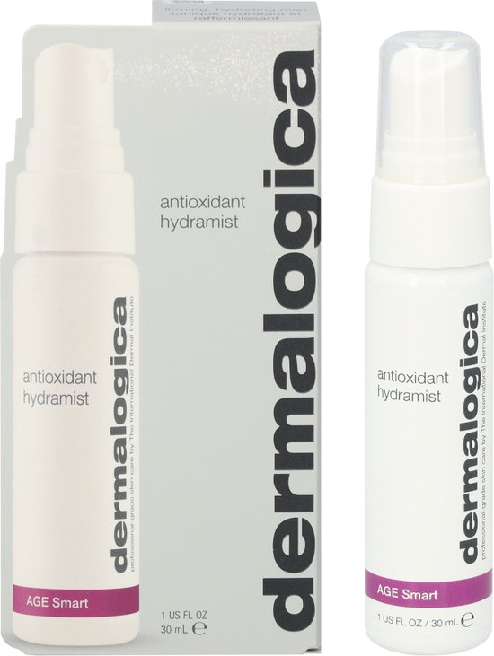 Dermalogica Age Smart Antioxidant Hydramist Spray Deze verfrissende spray biedt instant versteviging en wordt aanbevolen voor het voorkomen en behandelen van huidveroudering De formule biedt bescherming versteviging en intense hydratatie in een Een actief Vitamine C complex en peptides verstevigen en verbeteren de elasticiteit van de huid en verminderen fijne lijntjes Rozenolie en Kruidnagel verfrissen en kalmeren de huid Gebruik Spray over het gezicht en de hals na het reinigen Mag gedurende de hele dag gebruikt worden ook over make up