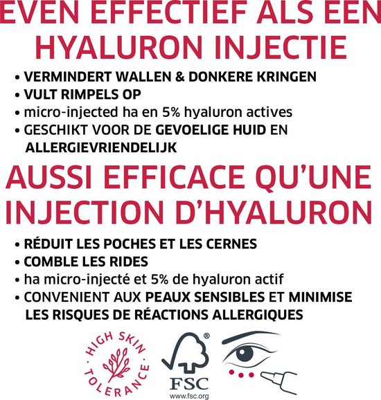 De diep werkzame hyaluron vult rimpeltjes op en maakt je huid zichtbaar gladder. De oogcrème bevat micro-geïnjecteerde HA (hyaluronzuur) en 5% werkzame hyaluron.