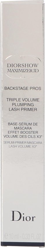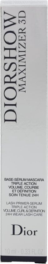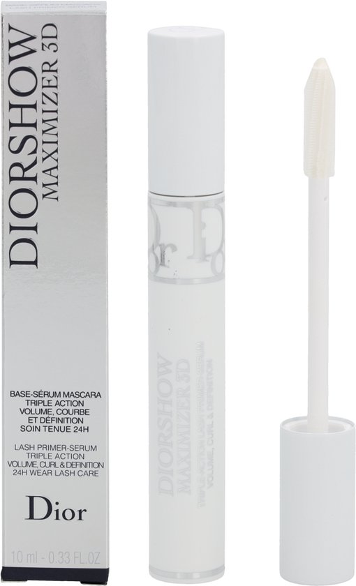 Diorshow Maximizer Wimper primer voor drievoudig volume. De nieuwe zuurstof gemêleerde textuur van Diorshow Maximizer omhult elke wimper met een volle luchtige laag om de effecten van de mascara te intensiveren. Verrijkt met Pure WhiteTM complex, onthult deze primer de optimale kleur en intensiteit van de wimpers. Het revitaliserende olie serum concentraat verbeterd de uitstraling van de wimpers, dikte en krul met een toenemend resultaat, applicatie na applicatie. De exclusieve serum-mascarabasis van Dior backstage geeft de wimpers onmiddellijk extra volume en heeft iedere dag opnieuw een verzorgend effect. Het borsteltje is van soepel elastomeer.