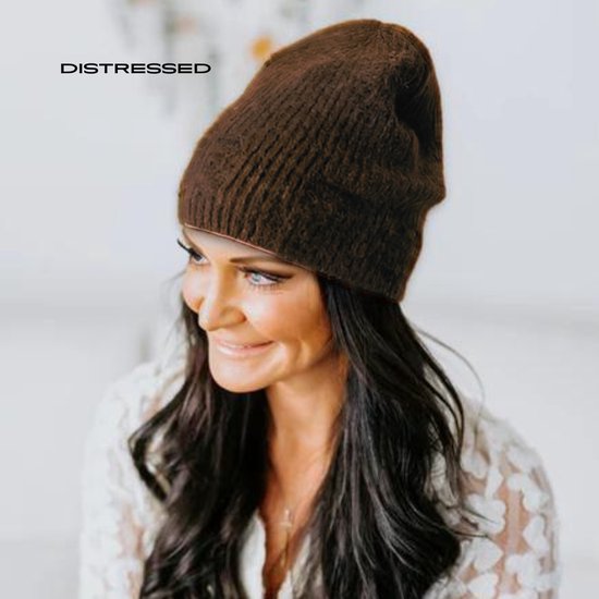 Distressed Woman Ripped Long Beanie / Muts – One Size – Dark Brown