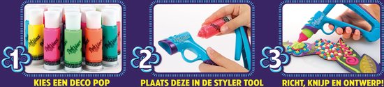 Plak ze op een ongeverfde ondergrond, zoals spiegels, glas, metaal en hout en versier ze met de Deco Pop tubes en Styler. Deze kleurige creatieve knutselset bevat 5 Deco Pop tubes, waarvan 2 met glitter. Doe simpelweg een tube in de Styler en richt, knijp… en versieren maar in stevige 3D lijnen!