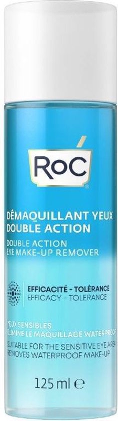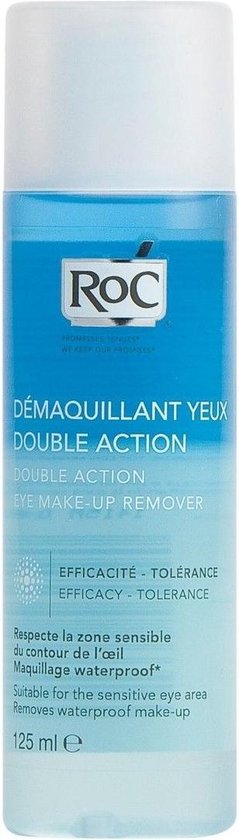 RoC Double Action Eye Make-Up Remover bestaat uit water én olie. Deze combinatie zorgt ervoor dat zelfs de meest hardnekkige (waterproof) oogmake-up verwijdert wordt. De remover is zacht voor de ogen en verzacht de huid rondom de ogen.