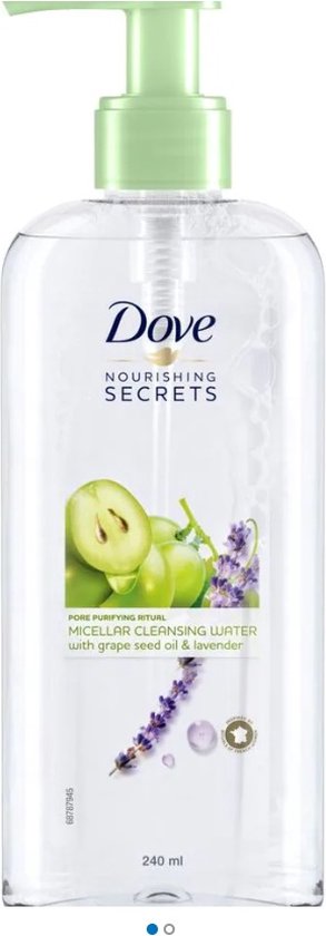 <p> Dove Nourishing Secrets Grape & Lavender Micellar Water, verrijkt met natuurlijk verkregen druivenpitolie en lavendelextract, verwijdert op milde wijze make-up, vermindert een vette glans en helpt puistjes voorkomen. </p> <p> De formule is zorgvuldig samengesteld in Japan en geïnspireerd op de rituelen van Franse vrouwen. Dit product kan ook worden gebruikt als dagelijks hydraterend water.<br /><br /><strong>De voordelen van Dove Nourishing Secrets Grape & Lavender Micellar Water:</strong><br />• Voor de vette en gecombineerde huid<br />• Verwijdert make-up en minimaliseert poriën<br />• Met druivenpitolie en lavendelextract<br />• Dermatologisch getest<br />• Geformuleerd in Japan<br />• Geïnspireerd door rituelen van Franse vrouwen<br /><br /><strong>Hoe gebruik je Dove Nourishing Secrets Grape & Lavender Micellar Water?</strong><br />1. Bevochtig een watje met micellair water (3-4 pompjes indrukken)<br />2. Houd het wattenschijfje zachtjes tegen je huid en verwijder make-up en onzuiverheden in opwaartse bewegingen, zonder overmatig te wrijven.<br />3. Om oogmake-up te verwijderen laat je het wattenschijfje een paar seconden op de oogleden rusten. Houd je ogen gesloten en verwijder vervolgens voorzichtig de make-up.<br />4. Afspoelen is niet nodig. Gebruik 2 – 3 wattenschijfjes voor het gezicht, de ogen en de lippen. </p> <p> EAN code: 8720182994332 </p> <p> <strong>Functionele Naam</strong><br />Micellair water </p>