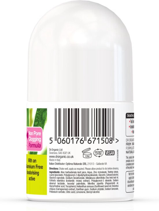 Een antibacterile deodorant vloeibare crme roll-on geformuleerd met gecertificeerde biologische tea tree olie, alo vera, zonnebloemolie, IJslands mos en vitamine E. Het neutraliseert geur en remt geurveroorzakende bacterin. Deze formule glijdt soepel en wordt snel geabsorbeerd, laat geen witte resten of vlekken achter en biedt langdurige bescherming. Geschikt voor veganisten.