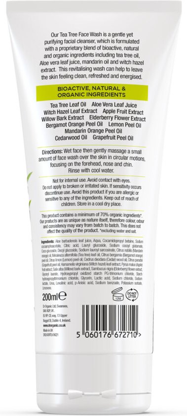 Onze Tea Tree Face Wash is een zachte maar zuiverende gezichtsreiniger, die is samengesteld met een gepatenteerde mix van bioactieve, natuurlijke en biologische ingredinten, waaronder theeboomolie, Alo vera-bladsap, mandarijnolie en toverhazelaarextract. Deze revitaliserende wasbeurt kan helpen om laat de huid schoon, verfrist en energiek aanvoelen. Geschikt voor vegetarirs.