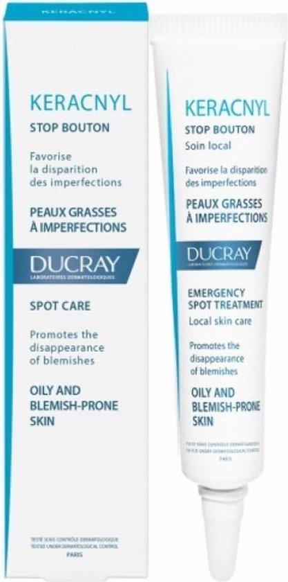 Ducray Keracnyl Stop Bouton gel is een SOS verzorging om direct op onzuiverheden aan te brengen. Voornamelijk in de T-zone (voorhoofd, neus en kin). De formule zuivert en droogt te onzuiverheden uit. Geschikt voor de vette huid.
