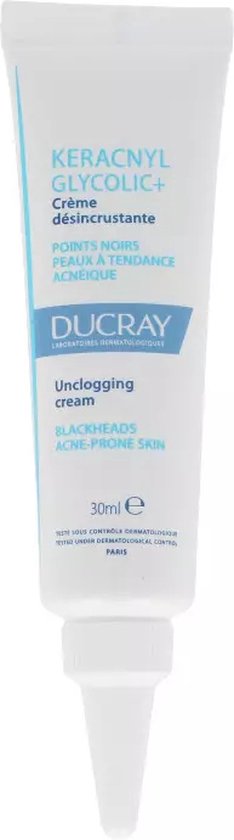 Ducray Keracnyl Glycolic+ Crème Désincrustante is een crème voor de huid met neiging tot acne die zwarte puntjes verwijdert en de huid textuur verfijnt. Glycolzuur reinigt de poriën diep op een zachte manier. Dankzij talg regulerende en matterende actieve bestanddelen wordt talg verminderd. De crème is dermatologisch getest. Geschikt voor de acne gevoelige huid.