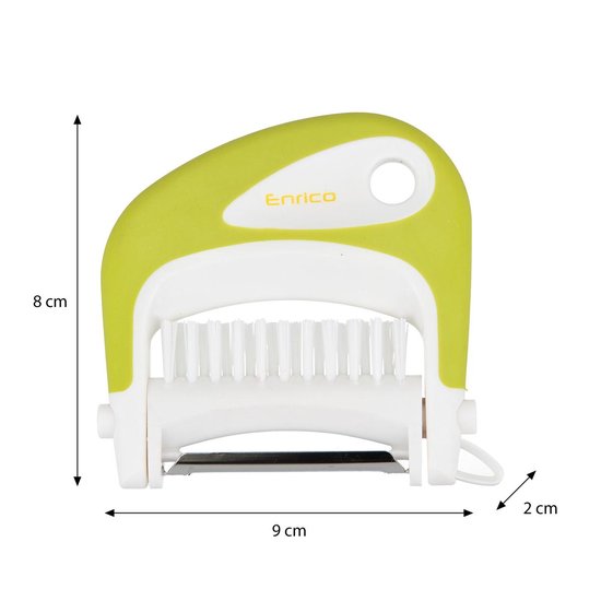 De Enrico Multi Peeler 3 in 1 Aardappelschilmesje is de must have voor in de keuken van de échte aardappel liefhebber. De Multi peeler is zowel een dunschiller, als borstel als ontpitter. De dunschiller heeft extra scherpe mesjes waarmee er extra dun geschild kan worden. De borstel zorgt ervoor dat de aardappelen aardevrij zijn wanneer u de aardappelen wilt gaan schoonmaken. De haren van de borstel zijn extra fijn en zo geschikt om het kleinste beetje vuil van de aardappelen af te halen. De borstel kan extra lang mee dankzij de hoogwaardige kwaliteit van de borstelharen. Aan de zijkant van de Multi tool zit een ontpitter waarmee de kleine plekjes en wortelrestanten van de aardappel gemakkelijk verwijderd kunnen worden zodat u de perfect schone, ronde, en mooie aardappel heeft.