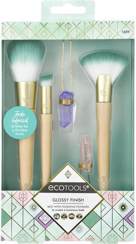 Ecotools Glossy Finish Set – Make-upborstel set Productbeschrijving: De Ecotools Glossy Finish Set bevat drie make-upkwasten en twee hairpins. De set is ideaal in gebruik met finishing make-up poeders voor een lichte, natuurlijke look.