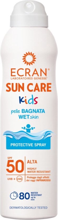 Ecran Kids Sun Care SPF50 is een zonnespray speciaal voor kinderen en heeft een zeer hoge beschermingsfactor. Deze zonnespray is ideaal wanneer je kinderen gaan zwemmen. Het kan zelfs op een natte huid worden aangebracht en is zeer waterproof. Ecran Kids met factor 50 beschermt de huid tegen zowel de schadelijke UVA- als UVB-straling en biedt hiermee optimale bescherming voor de tere kinderhuid. Bovendien is het gemakkelijk op de huid aan te brengen door te sprayen. Alleen nog even uitsmeren en je kind is klaar om de volgende duik te nemen.