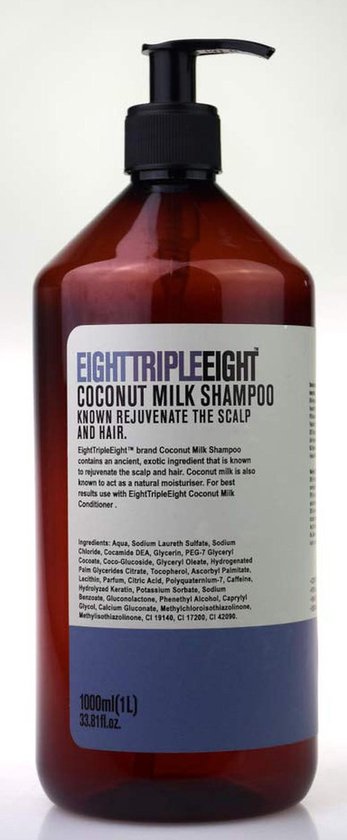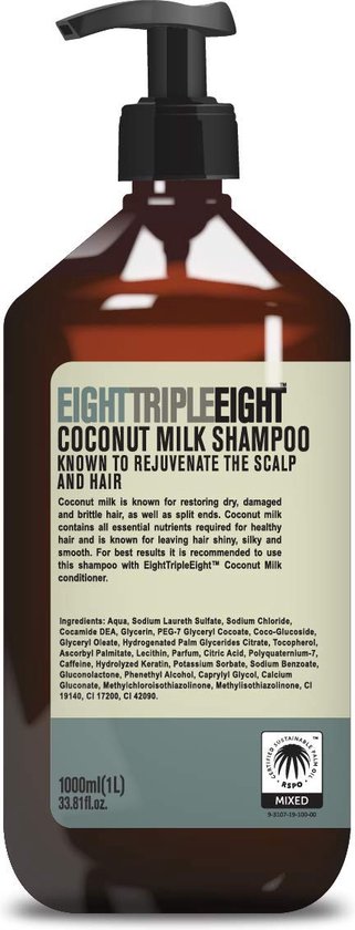 Zorg ervoor dat je verjongd, gehydrateerd, gezond ogend haar hebt met Eight Triple Eight Coconut Milk Shampoo. De kokosmelk helpt je hoofdhuid en haar te voeden, terwijl vetzuren, eiwitten en vitaminen diep voeden.