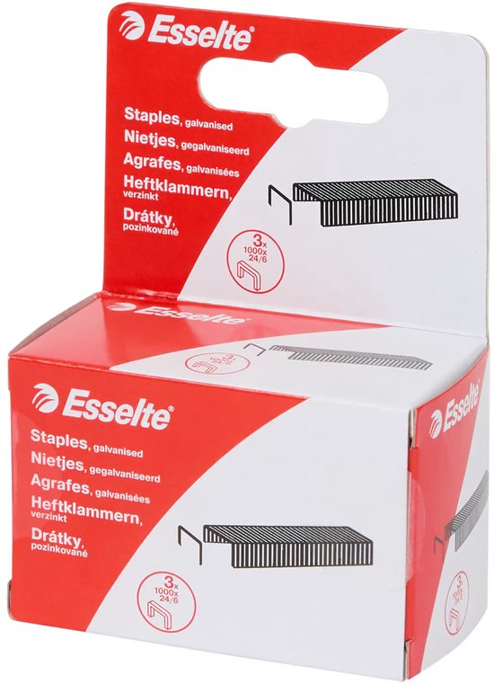 <p>Esselte – 3 pakjes gegalvaniseerde nietjes (3×1000 24/6) – totaal 9.000 nietjes.</p> <p>Verpakt in 1x doosje</p>