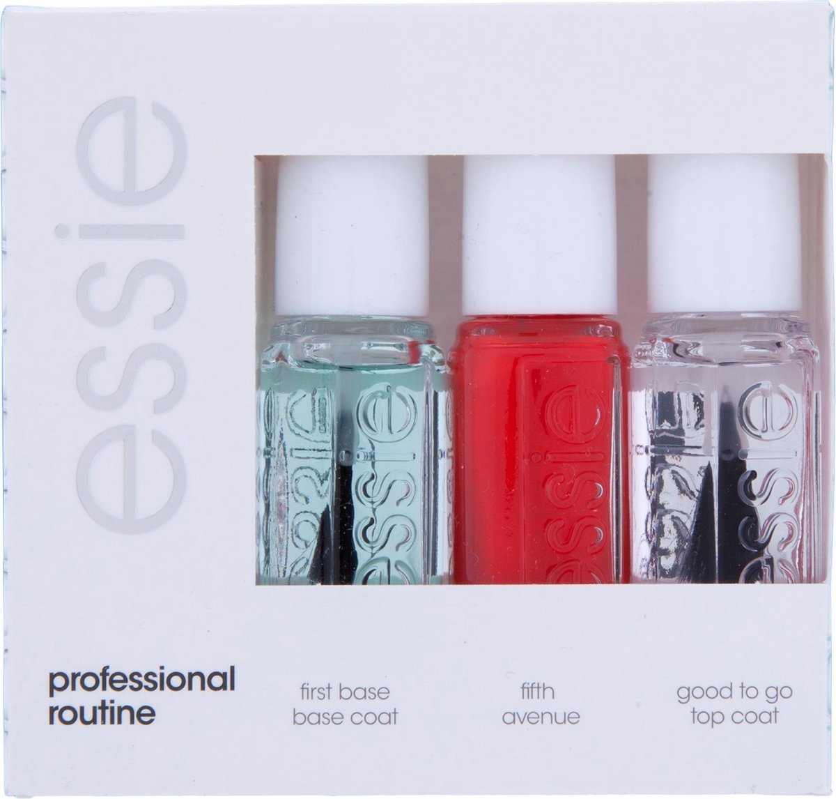 Essie Routine Collection 299 Fifth Avee. Inclusief nagelverzorgingsproducten: Basiscoating, Nagel topcoating, Nagellak, Kleur basisnagellak: Transparant, Basisnagellak coat-effect: Bescherming. Breedte verpakking: 86 mm, Diepte verpakking: 22 mm, Hoogte verpakking: 82 mm