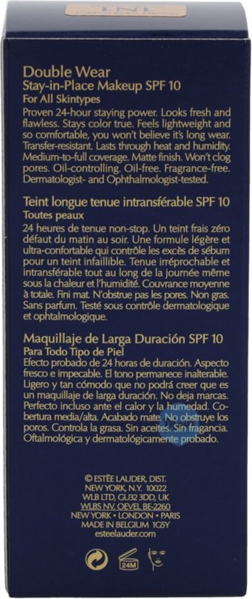 De Double Wear Foundation van Estée Lauder laat de huid er fris, egaal en natuurlijk uitzien. Deze lang dragende foundation voelt comfortabel aan op de huid en heeft geen touch-ups nodig. De Double Wear foundation heeft een matte finish en reguleert de huidoliën voor een matte finish gedurende de gehele dag. De foundation heeft een gemiddelde dekking die opgebouwd kan worden tot een volledige dekking en is zo geformuleerd dat deze niet afgeeft. Zweet- en waterproof. Olie en parfum vrij. Dermatologisch getest.