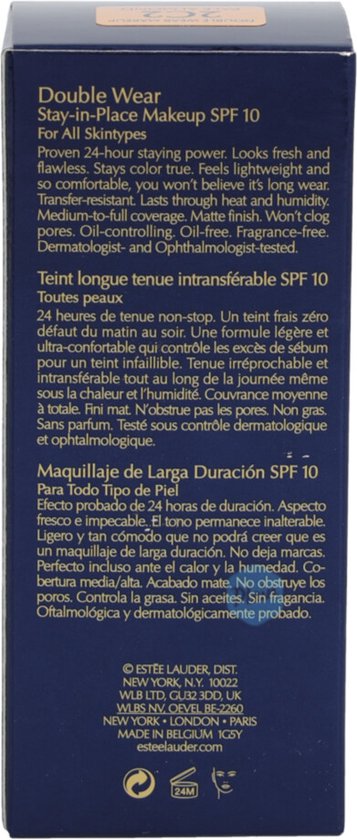 Deze lang dragende foundation voelt comfortabel aan op de huid en heeft geen touch-ups nodig. De Double Wear foundation heeft een matte finish en reguleert de huidoliën voor een matte finish gedurende de gehele dag. De foundation heeft een gemiddelde dekking die opgebouwd kan worden tot een volledige dekking en is zo geformuleerd dat deze niet afgeeft. Zweet- en waterproof. Olie en parfum vrij. Dermatologisch getest.