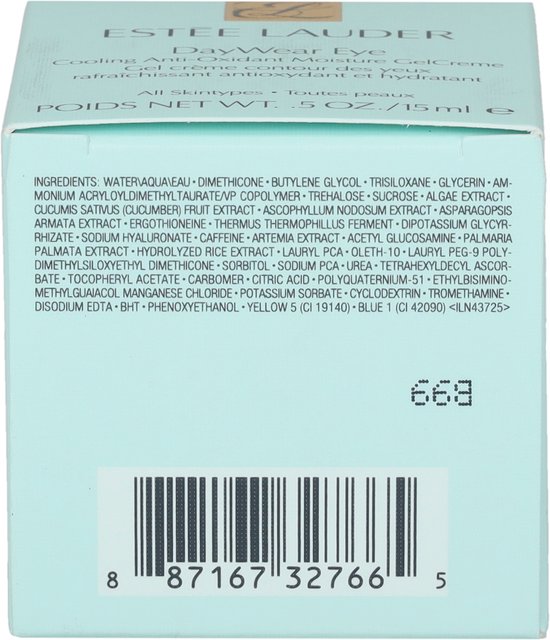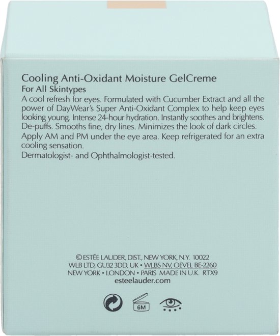 Estee Lauder DayWear Eye Cooling Anti Oxidant Moisture Gel Creme Deze gel crA me voor de ogen is verrijkt met komkommerextract en de krachtige werking van het Super Anti Oxidant Complex van DayWear om de ogen een blijvend frisse uitstraling te geven Donkere kringen worden zichtbaar verminderd en droogtelijntjes worden gladgemaakt de ogen zien er gekalmeerd en jonger uit Gebruik Breng de gel crA me elke ochtend en avond aan onder de ogen