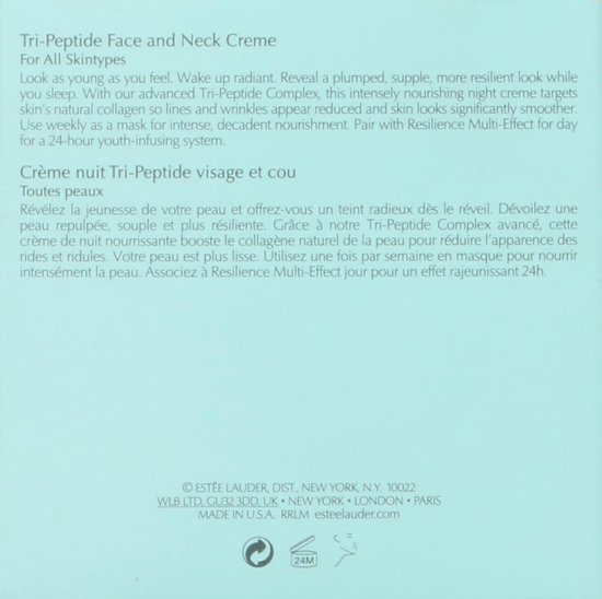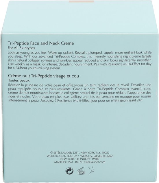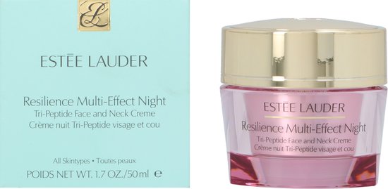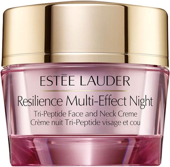 Estee Lauder Resilience Lift Night Lifting Firming Face and Neck Creme Deze intens voedende hydraterende nachtcreme en wekelijks masker in een herstelt de huid optimaal De voedende creme is verrijkt met een krachtig Tri Peptide Lift Complex en maakt de huid duidelijk elastischer steviger en gladder Fijne lijntjes en hals rimpels vervagen er ontstaat een jeugdige look Gebruk Breng de creme elke avond aan op het gezicht en de hals Of gebruik het als masker breng de creme dan een keer per week royaal aan op het gezicht en de hals laat het 10 minuten inwerken en daarna de creme verwijderen met een doekje